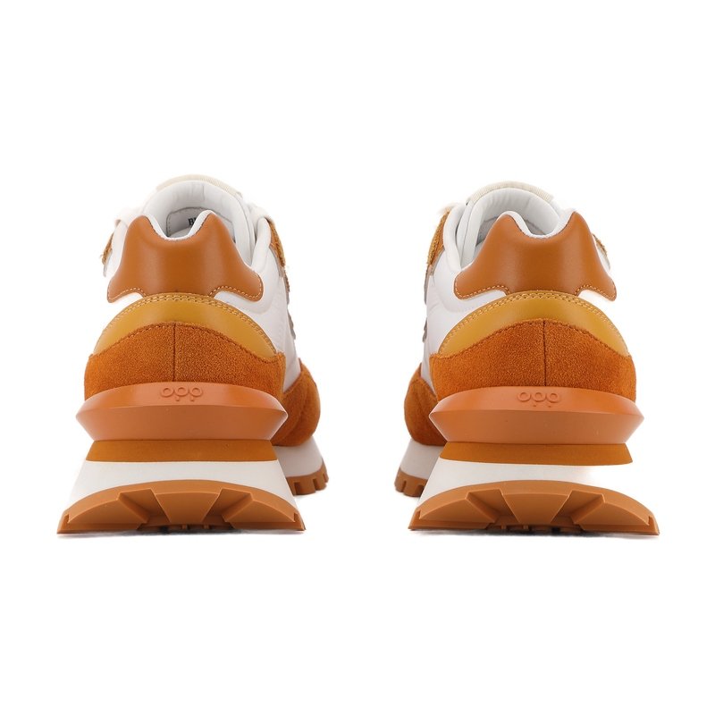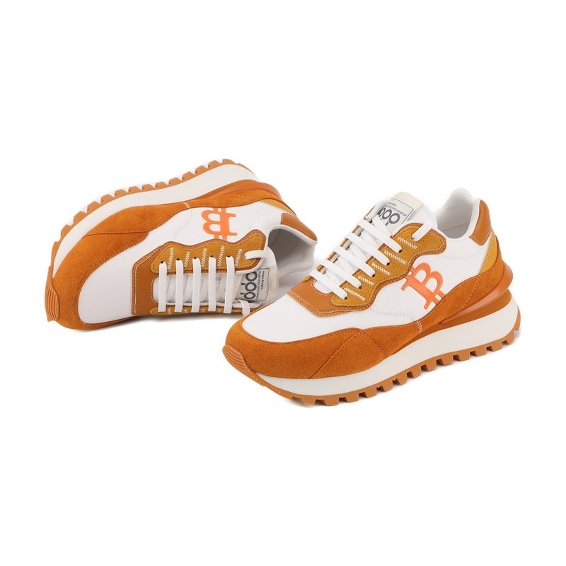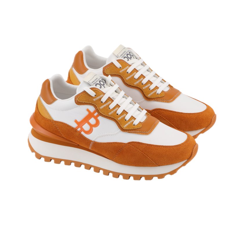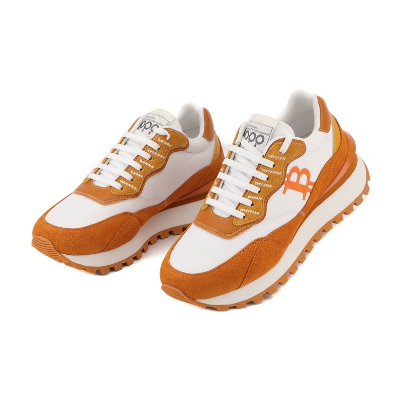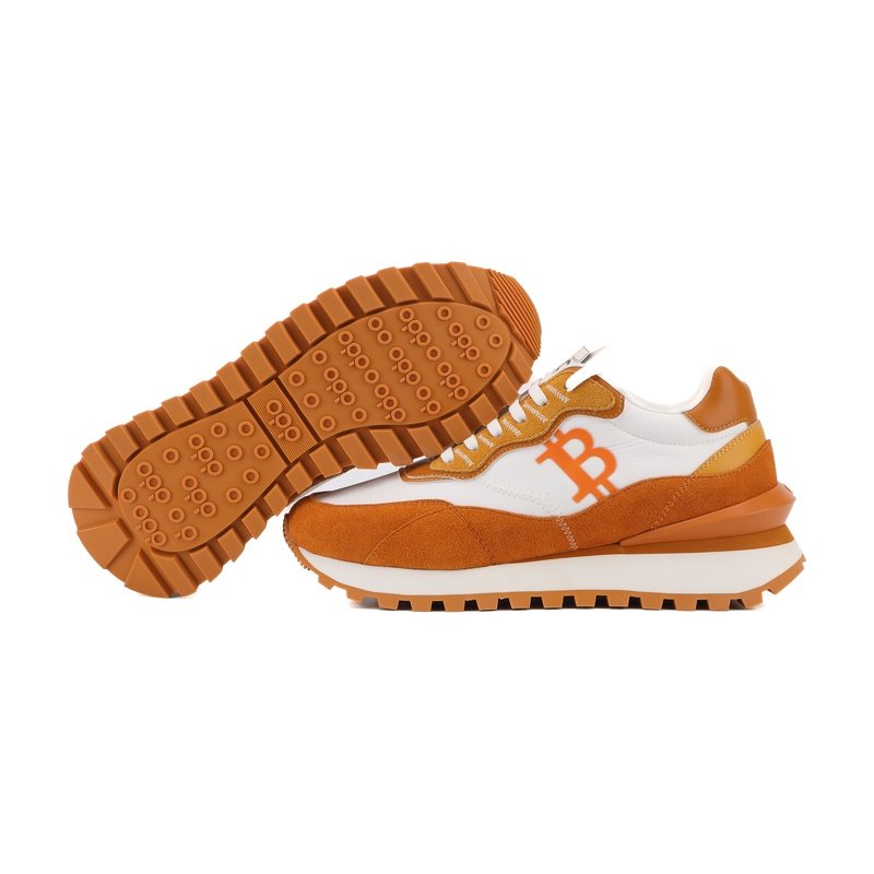 A fresh take on the digital revolution. This iteration of the OPPCOLOR collection pairs a clean, minimalist white leather base with striking burnt orange suede overlays. Designed for the modern visionary, it features the iconic Bitcoin symbol as a bold statement of the new financial era.